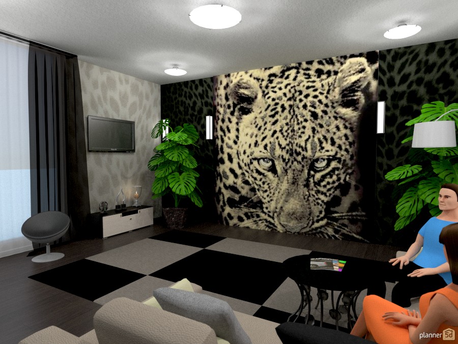 гостиная выполнена преимущественно в двух цветах,отталкивалась от леопардовых обоев
