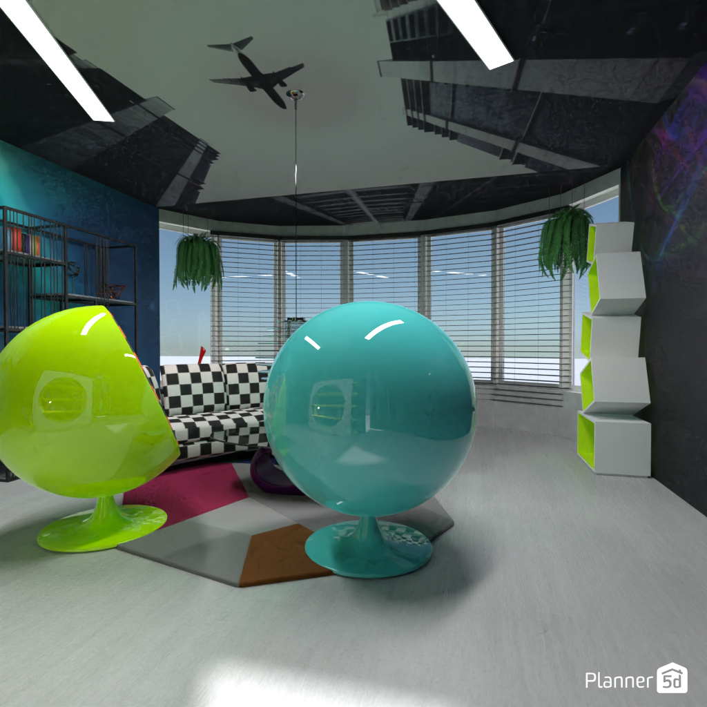 Спроектируй гостиную в стиле футуризм: неоновое освещение, мебель необычной формы.