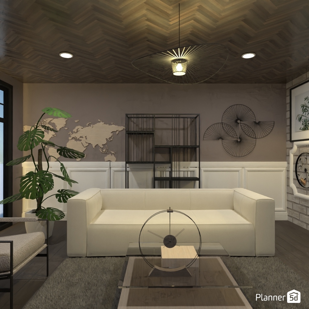 Спроектируй гостиную с этими материалами: кирпич, металл, кожа.