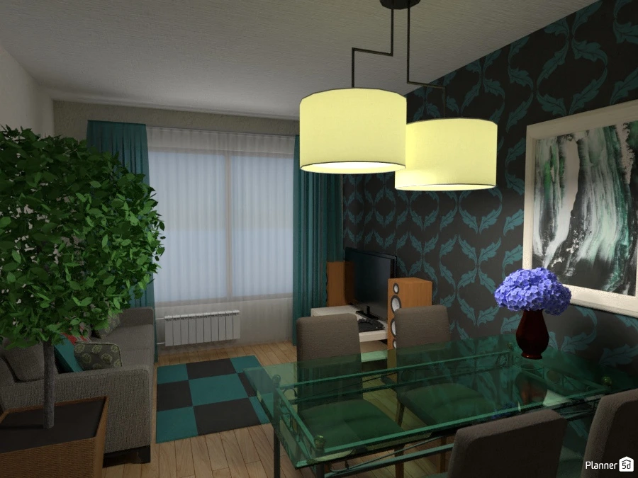 Уютная гостиная, совмещенная с кухней, оформленная в современном стиле.В проекте использованы простые материалы, создающие ощущение комфорта и расслабленности.
