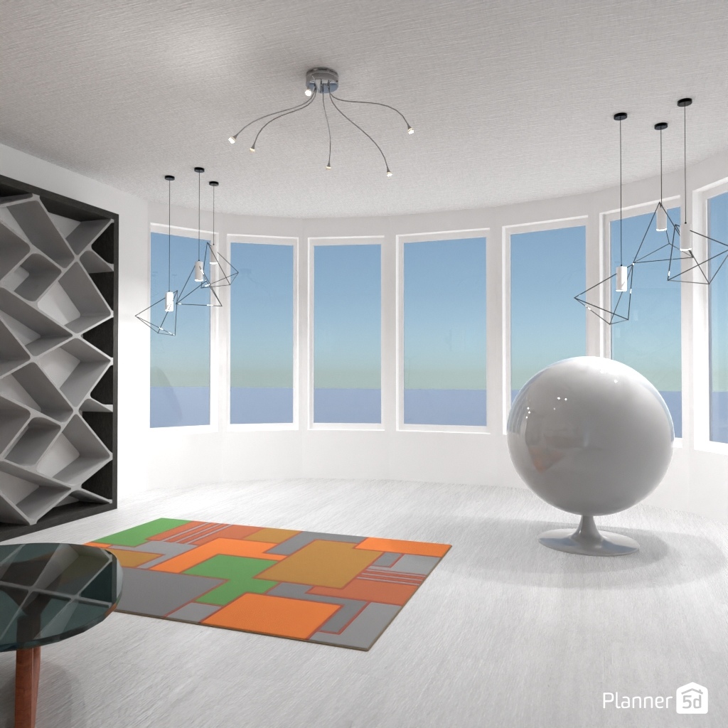 Designa ett futuristiskt vardagsrum: neonbelysning, formade möbler."