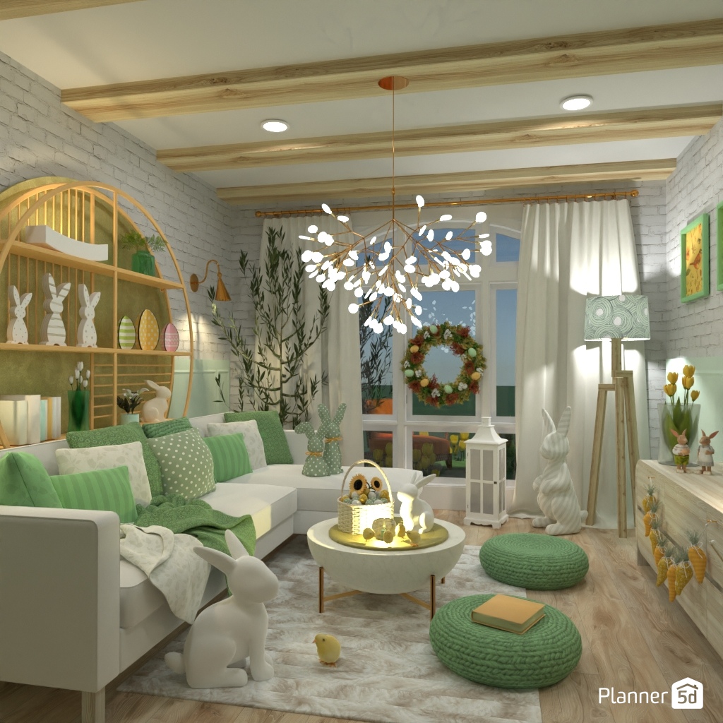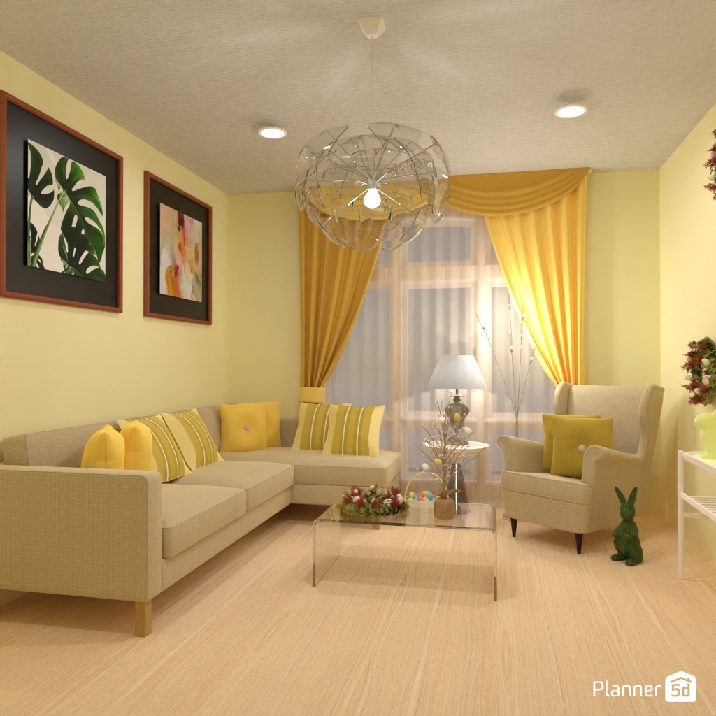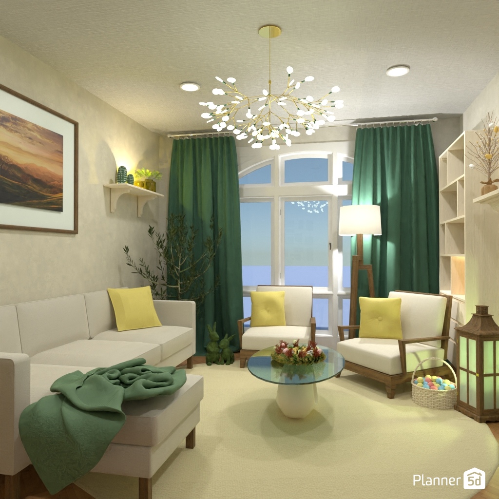 设计一个带有绿黄色调的明亮客厅内饰。