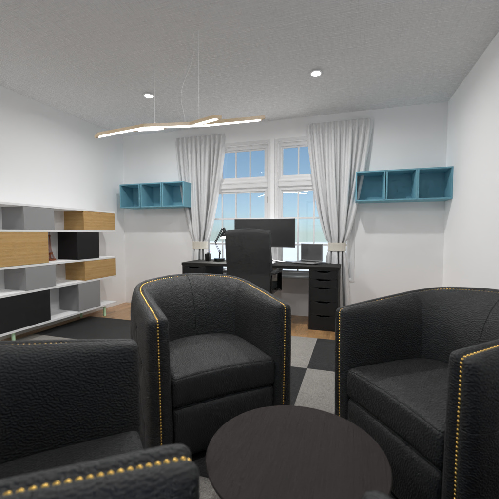 创建一个家庭办公室内饰,其中包括一面蓝色墙壁。