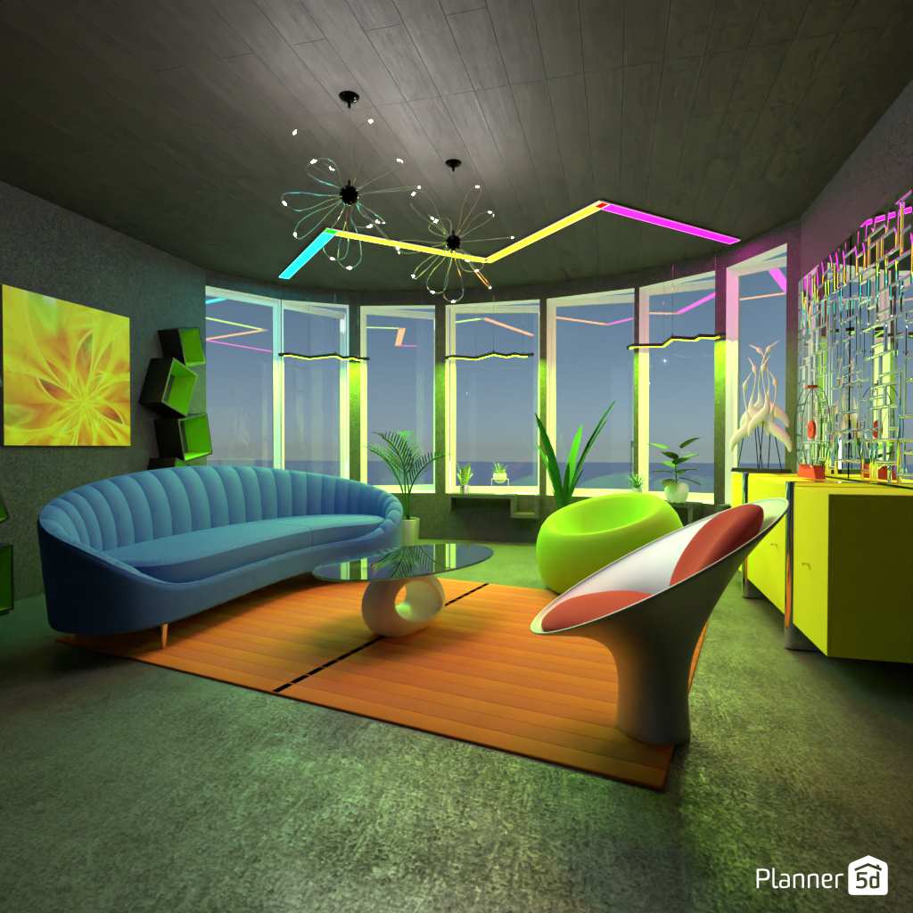 设计一个未来主义客厅:霓虹灯光,造型家具。