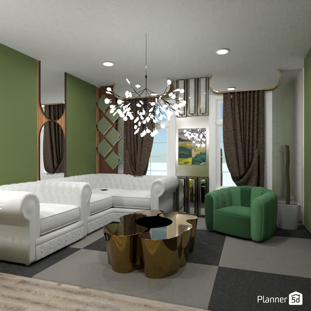 设计一个带有镜面墙装饰的客厅。