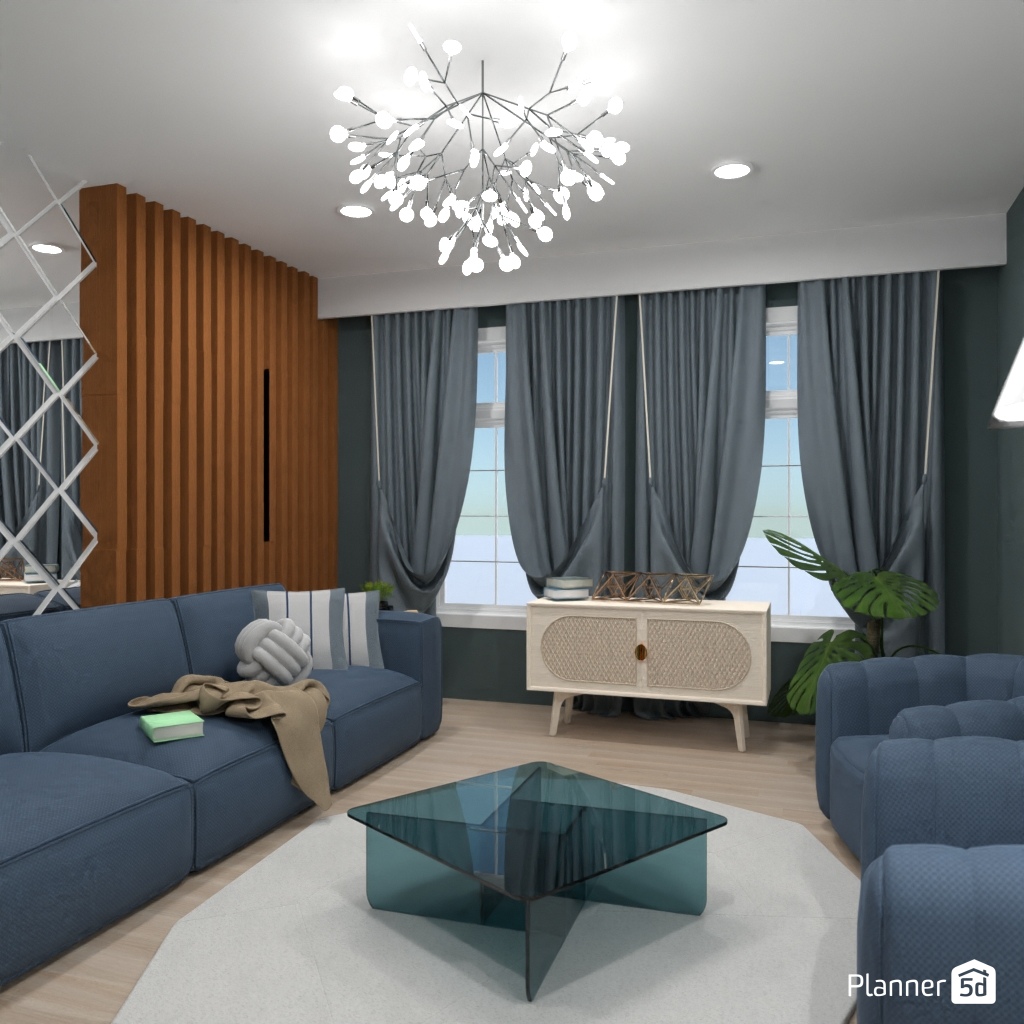 设计一个带有镜面墙装饰的客厅。