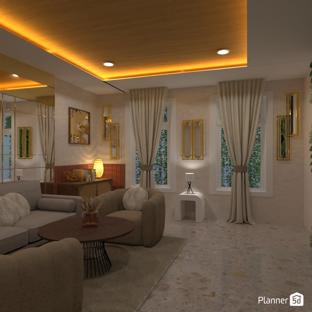 设计一个带有镜面墙装饰的客厅。