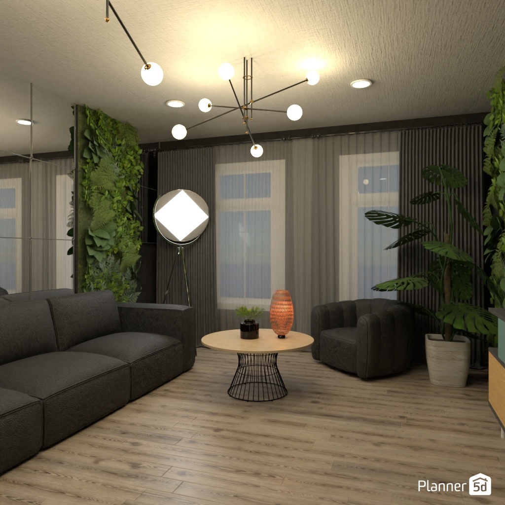 设计一个带有镜面墙装饰的客厅。