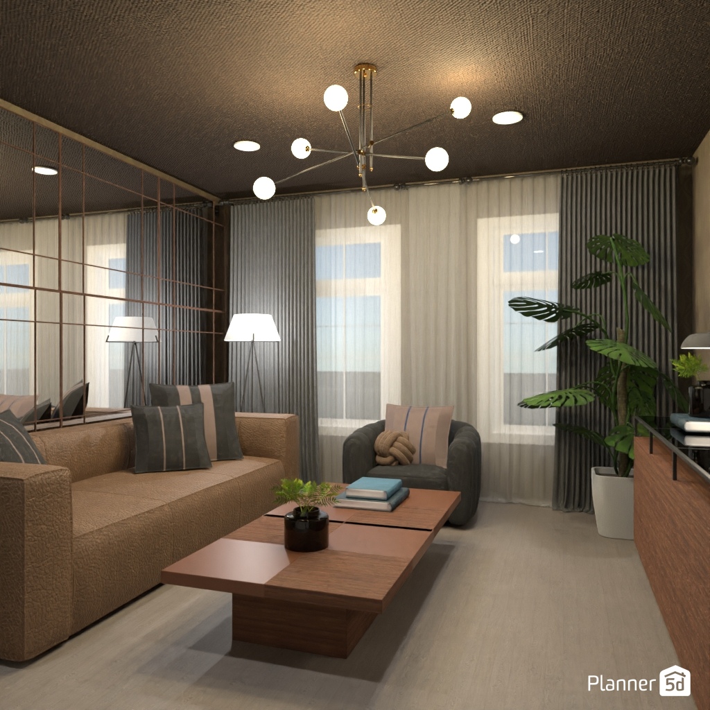 设计一个带有镜面墙装饰的客厅。