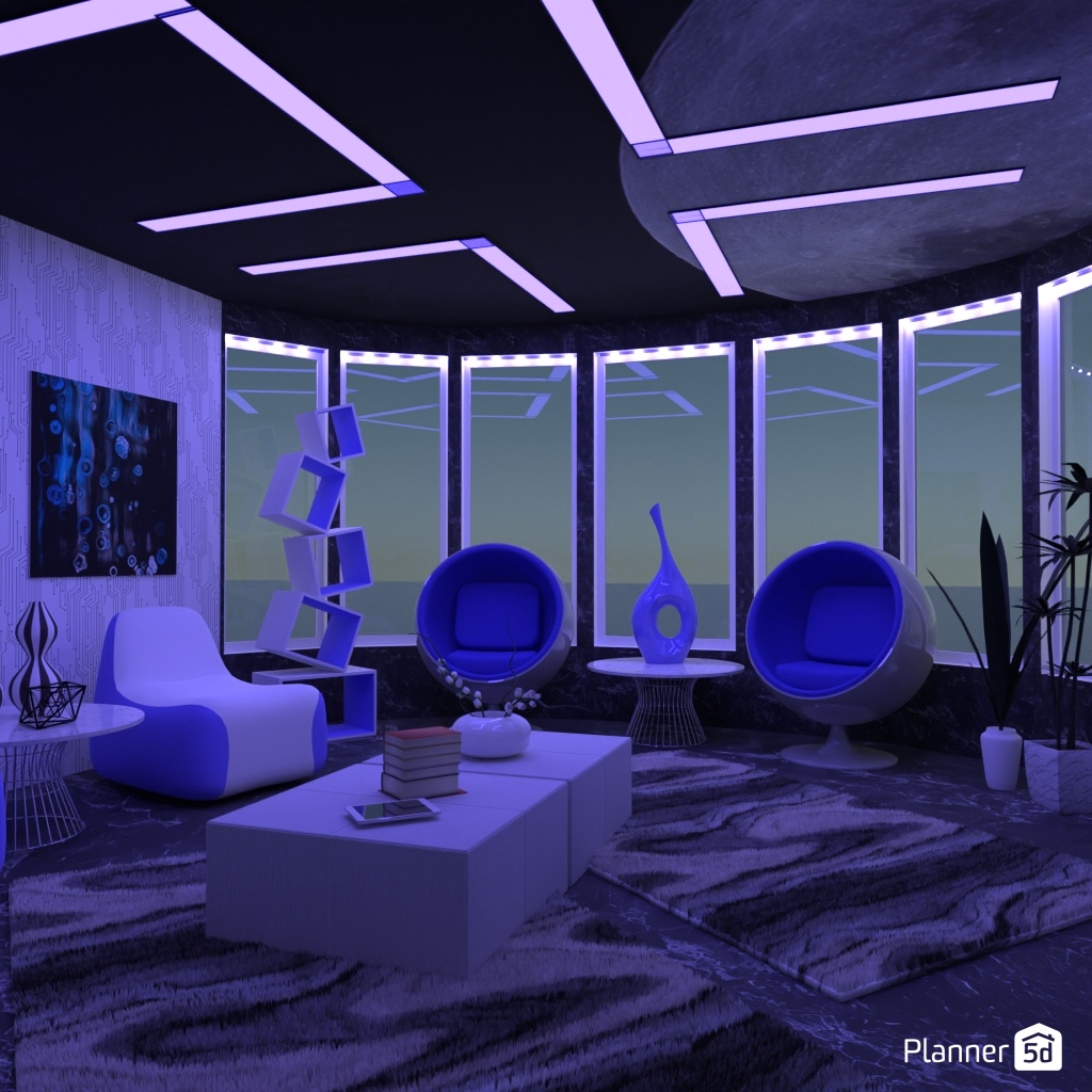 设计一个未来主义客厅:霓虹灯光,造型家具。
